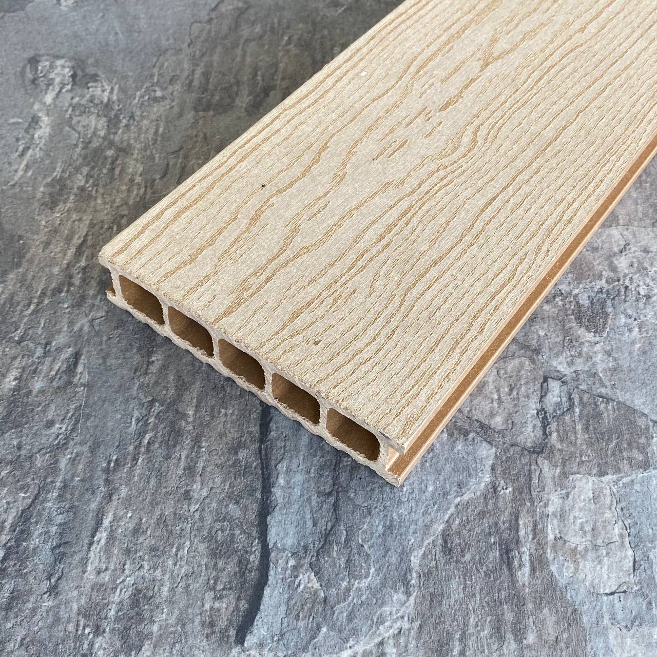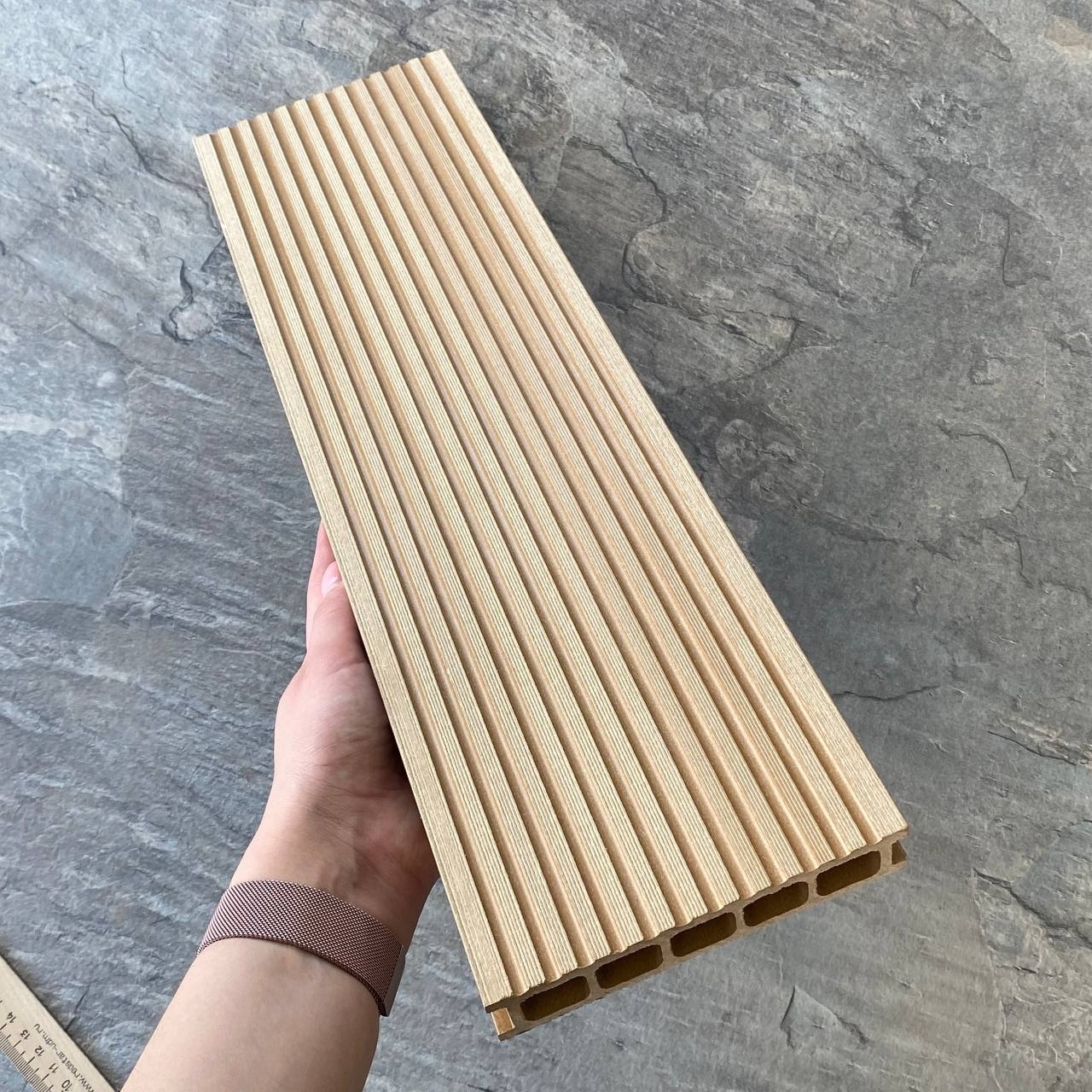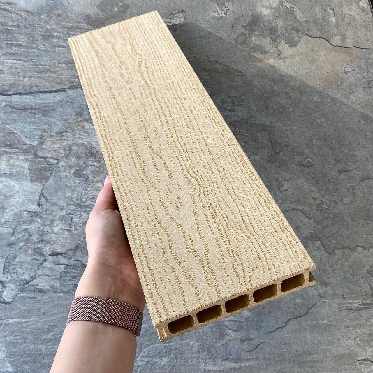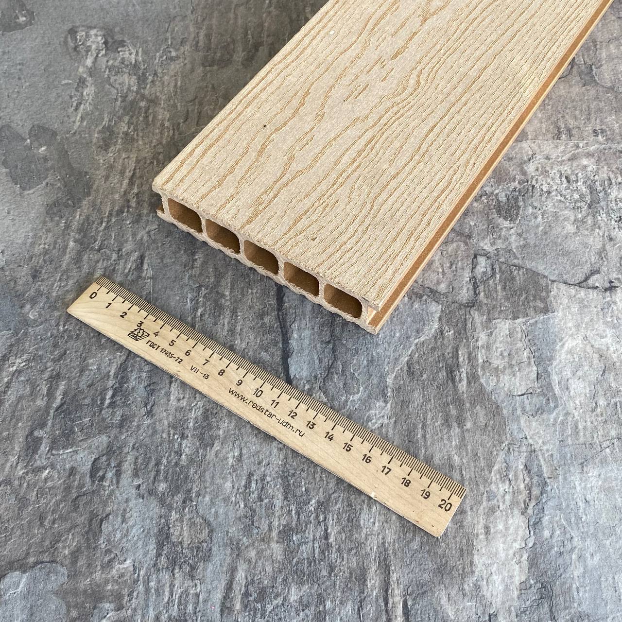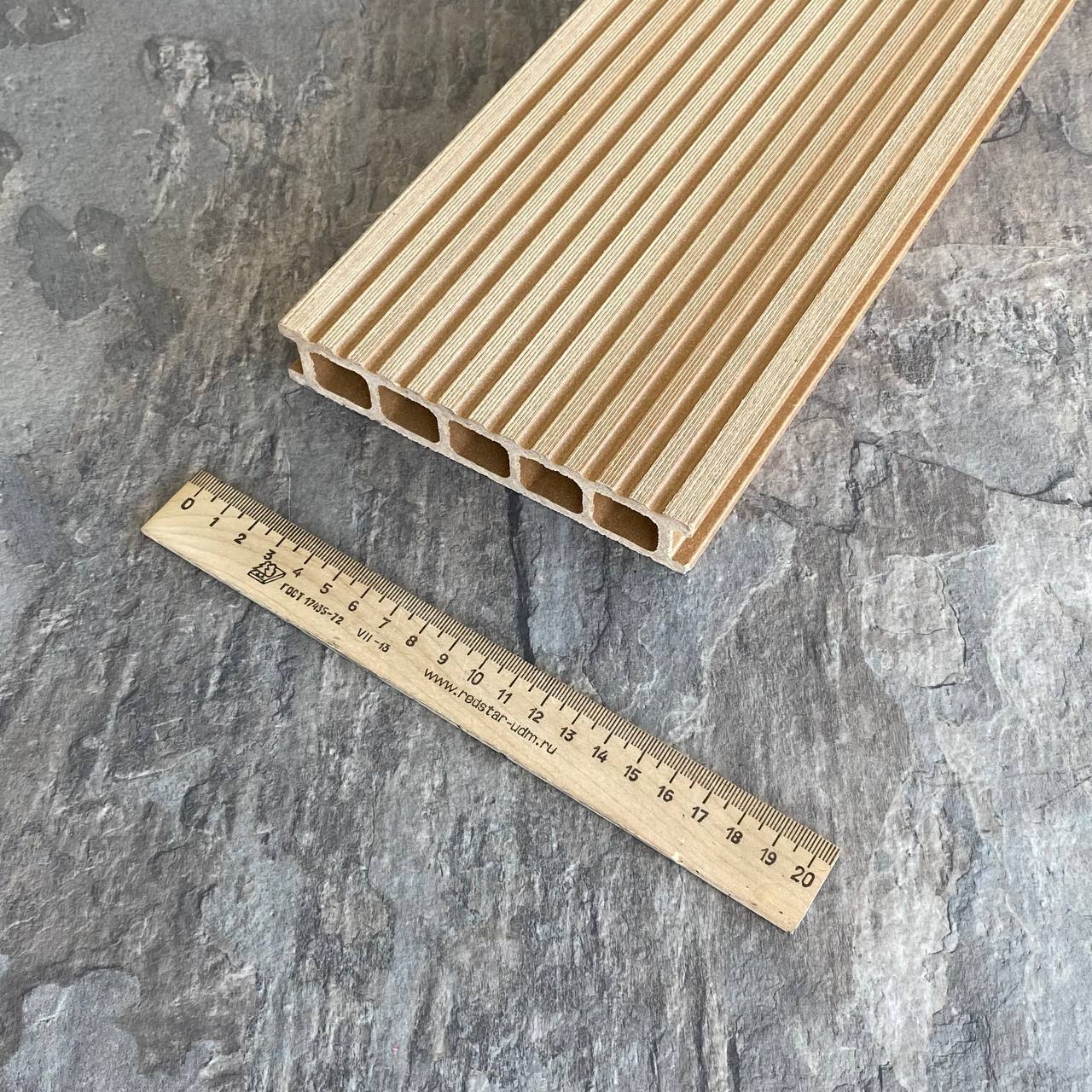 Террасная доска Latitudo Euro из древесно-полимерного композита ДПК. Пустотелая. Доступные размеры, мм: 139х27х3000, 139х27х4000, 139х27х6000. Поверхности: одна сторона шлифованное тиснение «под дерево», другая сторона «вельвет». Доступно 5 цветов: «Венге», «Шоколад», «Натур», «Антрацит», «Серый». Фирменные комплектующие в цвет: торцевая заглушка, уголок.