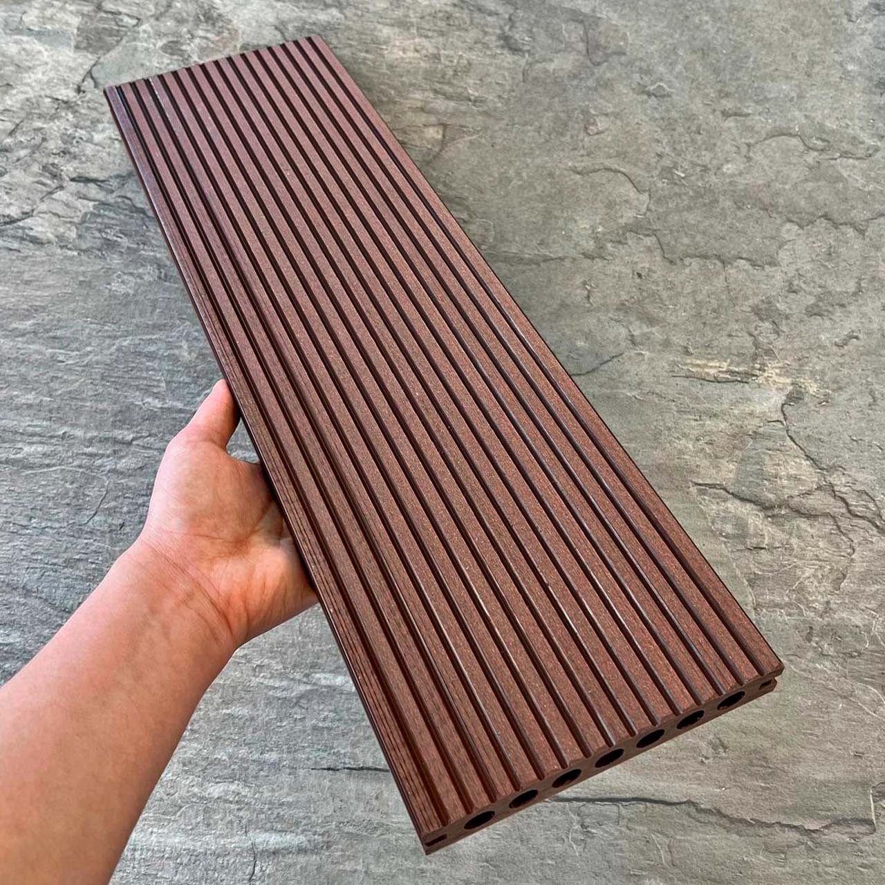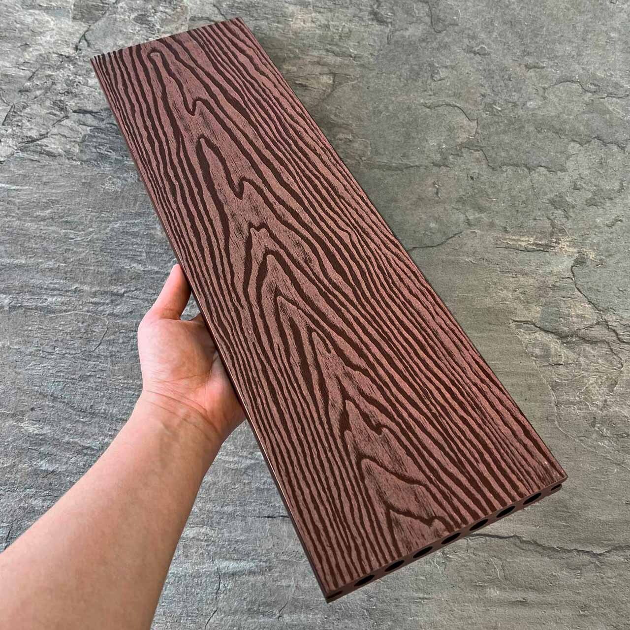 Террасная доска Latitudo PRO 2 из древесно-полимерного композита ДПК усиленная. Пустотелая. Доступные размеры, мм: 145х22х3000, 145х22х4000, 145х22х6000. Длина 3, 4 и 6 метров. Поверхности: одна сторона с рельефной 3D-фактурой «под дерево», другая сторона «вельвет». Доступно 5 цветов: «Венге», «Каштан», «Орех», «Серый», «Натур». Фирменные комплектующие в цвет: уголок, ступень, заборная доска.