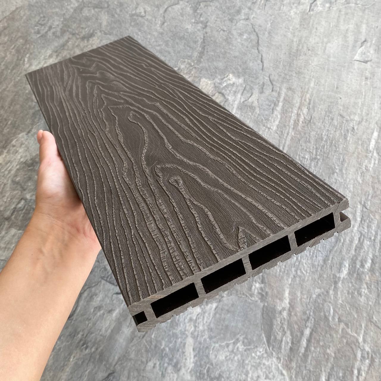 Террасная доска Latitudo Vintage из древесно-полимерного композита ДПК усиленная. Пустотелая. Доступные размеры, мм: 150х24х3000, 150х24х4000. Длина 3 и 4 метра. Поверхности: одна сторона с рельефной 3D-фактурой «под дерево», другая сторона «вельвет». Доступно 4 цвета: «Венге», «Графит», «Орех», «Серый». Фирменные комплектующие в цвет: ступень, уголок, заборная доска.