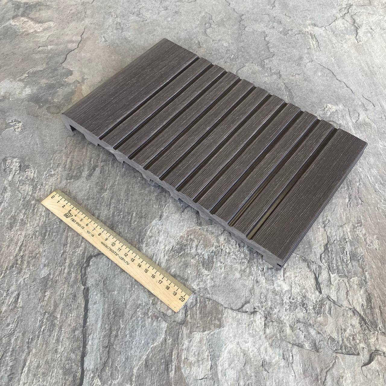 Ступень ДПК Latitudo Step-342. Доступные размеры, мм: 342х23х3000, 342х23х4000. Длина 3 и 4 метра. Поверхность: одна сторона с текстурой «крупный вельвет». Доступно 4 цвета: «Венге», «Графит», «Орех», «Серый». Фирменные комплектующие в цвет: террасная доска, заборная доска, уголок.